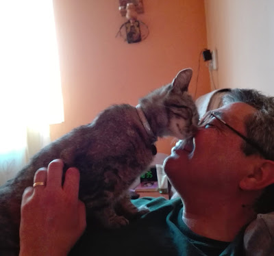 Abia am putut sa aleg cateva fotografii din multele facute la momentul respectiv, mare parte din ele fiind miscate fiindca eu nu ma puteam opri din ras. Faza a fost in felul urmator: pisi statea fain-frumos pe mine si torcea, ceea ce e un lucru obisnuit, si dintr-odata se ridica si se duce catre sot si da spectacolul asta ce se vede in imagini. Pe amandoi ne-a umflat rasul pentru ca era prima-prima oara cand se intampla asta. La nivelul asta de "pupaceli" :) noroc ca eram cu telefonul in mana si am putut face poze, mai miscate mai ne...